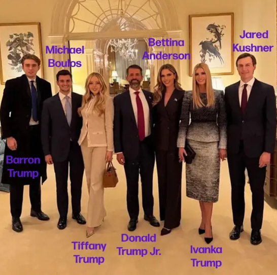 Also featured in the picture were Jared Kushner, Ivankaโ€™s husband and a former advisor to Trump, Bettina Anderson, Donald Jr.โ€™s girlfriend, and Michael Boulos, Tiffanyโ€™s husband.