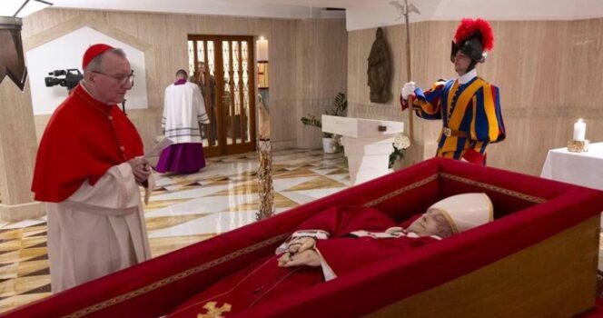 Lying in an open casket, Francis is dressed in red vestments — a color that symbolizes martyrdom and the blood of Christ, with a rosary folded gently in his hands. His coffin, watched over by ceremonial guards, allowed his household and Vatican officials to bid a private and respectful adieu.