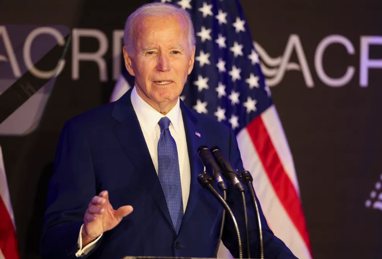 Wearing a deep blue suit, complemented by a white shirt and a matching blue tie, Biden stood against a backdrop of American flags and the ACRD logo, presenting himself with his usual composed and focused demeanor.